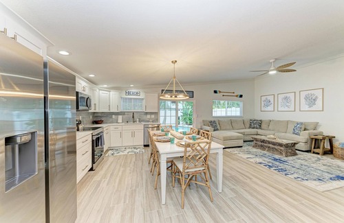 The modern kitchen is fully stocked with cookware, stainless steel appliances, and plenty of counter space to prepare family meals or beach snacks. A dining table offers space for shared meals, while the poolside patio is perfect for outdoor dining under the Florida sun.
