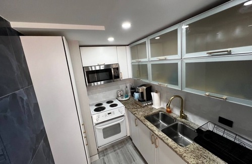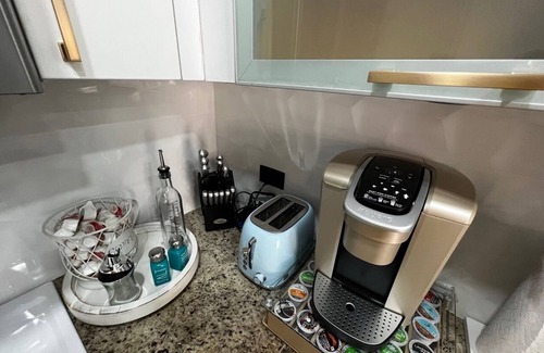 The kitchen is a new European style with quartz countertops. Inside the kitchen we provide you with a Keurig coffee maker, a toaster, hot water kettle heater. As well as silverware, pots, pans and plates to pretend like you are going to cook yourself dinner from scratch :-)