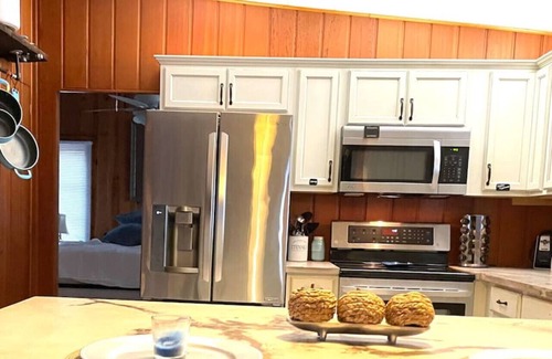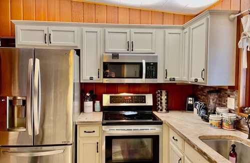 Incredible views, starry night sky. Enjoy sprawling top deck, downstairs patio, & adjoining bonus addition separate entrance en suite, brick fire pit, Hot tub with a view, southern style front porch, The top floor is one King bedroom, fully equipped kitchen, large open floor plan sunroom & dining table for 6, Enjoy our peaceful lakeshore retreat. Quiet & serene, fishing, and enjoy the use of our 2 kayaks.