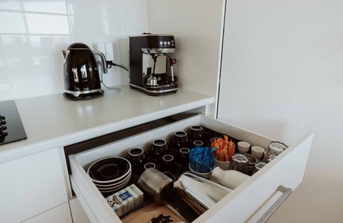 The fully equipped kitchen makes meal preparation a breeze, with eco-friendly products and high-quality appliances throughout. The small bar area is an ideal spot to enjoy your morning coffee or a quiet drink, all while soaking in the stunning views of the ocean and rocky coastline.