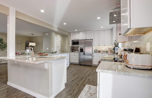 Prepare a quick snack or a large feast in the fully stocked kitchen. It features beautiful countertops and modern appliances including a refrigerator, stove, oven, microwave, and drip/pod coffee maker.