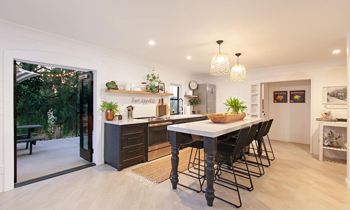 The kitchen is fully equipped with new high-end appliances with a large center island that you can pull up a stool and have your morning coffee. Go out the french doors to the back patio where you can enjoy a meal under the market lights.