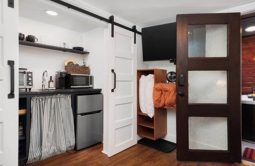 Welcome to our cozy basement basecamp. Get ready to dive into the tiny home vibes with a 2-person hot tub, kitchenette, smart TV, and a foldout sofa bed for relaxation and efficiency! Ideal for travelers passing through or lovebirds looking for a snug spot to hunker down. PLEASE NOTE: If you choose to book, you will be in a 8'x10' (Main room) studio and sleeping on a pull out sofa bed! Consider it glamping! Please take this into consideration before making your vacation decision.
