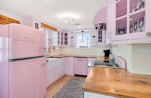 Inside, you'll find vibrant and creative decor that evokes the carefree spirit of summer along with delightfully unique themes for each room. Upon entry you'll be greeted by a cotton candy colored kitchen, even the appliances play along! The adjacent living room theme pivots to black and white with a cozy striped sectional and wooden chairs for additional seating. The dining room has ample seating for 8 and is anchored by a jocose wrought iron floral light fixture.