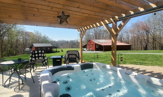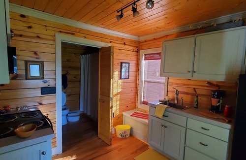 This ideal couple's retreat is a super cozy cabin located on our private property. This cabin has all the amenities of home in approx. 400 sf with an amazing amount of storage. It has a full bath and kitchen. It has a full bath and kitchen. Enjoy the private pergola patio! Dine outside after preparing your meals on the Blackstone griddle grill, enjoy sitting on the rockers while watching the deer cross the lower field, swing in the hammocks AND relax in the hot tub under the starry sky! This cabin has all the amenities of home in approximately 400 sf with an amazing amount of storage. It has a full bath and kitchen. During the day, visit the local attractions and come back to The Cabin to chill in the evenings! Located on a quiet county road, this cabin has farmhouse charm. Rock into tranquil comfort on the front porch. On cool nights snuggle up by the gas firepit table out back. The property is just minutes from Hanging Rock State Park. There you can hike, fish, mountain bike, kayak or canoe the day away. You could also tour the Yadkin Valley wineries for a fun day trip. Well within an hour you could be in Mayberry, the Blue Ridge Parkway, historic Old Salem or Pilot Mountain. The backyard is spacious for playing yard golf, darts, disk golf or corn hole. If you bring your bike or kayak, you can store it in the barn. But the real charm of this place is the quiet retreat of a place to rest at the end of fun packed day.