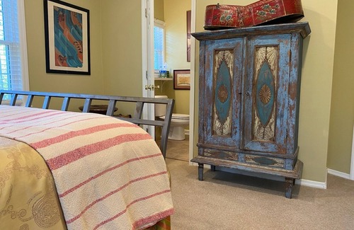 The Birdnest Inn is a Bed and Breakfast located in an urban farm environment in Aiken, South Carolina, close to golf courses and equestrian competitions. The Cardinal Room is a soft contemporary setting that has a Queen Bed, chaise, vintage trunk, and an Indonesian armoire and a bath with a shower enclosure.