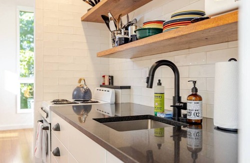 Every inch of the carriage house was thought out in meticulous detail and it shows! With style and energy efficiency top of mind, it is truly a welcoming and impressive space. The high ceilings give an open and airy feel, while the height and surrounding lush greenery give you a bit of a treehouse vibe. The bathroom is gorgeous, and the kitchen is perfectly planned to maximize functionality without sacrificing style -- the dishwasher, refrigerator, and freezer are all hidden drawer-style. Luxury sheets and 100% cotton quilts will have you sleeping like a dream!