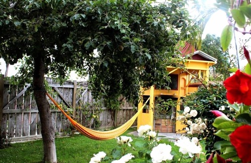 Fully fenced, nestled in organic gardens. Off-street parking.