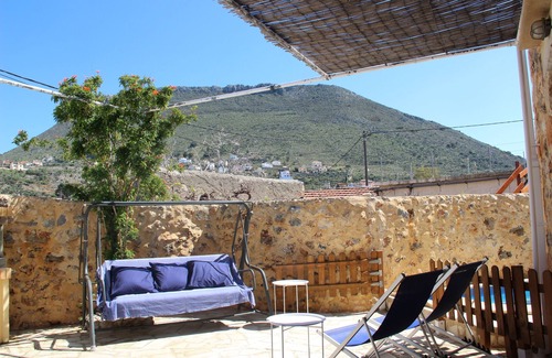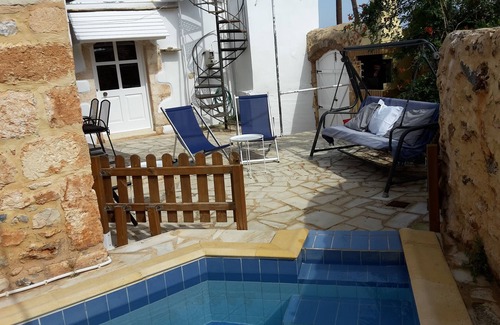 The charm of Arismari lies in its traditional stone structure, the shaded lower terrace with a pool for cooling off, and its pergola on the upper terrace with 160° views over Souda Bay and the mountains. These areas are ideal for relaxing and unwinding. The house is in the heart of a small, typical Cretan village where Zorba the Greek was filmed (Kokkino Horio). It is completely unoverlooked, away from the main tourist routes and immersed in a very local atmosphere. Ideal for families with children or small groups, it is a simple house with all the comforts of a main residence (fully-equipped kitchen, appliances, good bedding, air conditioning in the living room, mosquito netting on the windows). There are 3 bedrooms, sleeping 6. There is also a cot for children up to 7 years old in the downstairs bedroom and 1 sofa bed in the living room. A wifi internet connection is available, as well as board games, books and a hi-fi system to which you can connect your smartphone (jack plug). The swimming pool is enclosed by a barrier. In the village you'll find Yoannis's taverna, with a beautiful view over Souda Bay, and the minimarket of Geourgous. A 20-minute walk will take you to the Koutalas cove for a swim and to the underwater caves for snorkelling (the return journey is quite steep). The beaches of Apokoronas (Almirida, Kalives, Kalami) are 4 km away. The old Venetian port of Chania (the historic capital) is a 45-minute drive away.