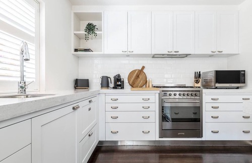 This freshly renovated, ground floor stay features thoughtful furnishings and a soothing white palette, offering a tranquil space to unwind after a day of work or sightseeing. An open-plan kitchen, dining and lounge area is well-appointed with everything you need to prepare meals at home, allowing you to stock up on fresh gourmet produce at the renowned Prahran Market to cook up and enjoy at the breakfast bar.