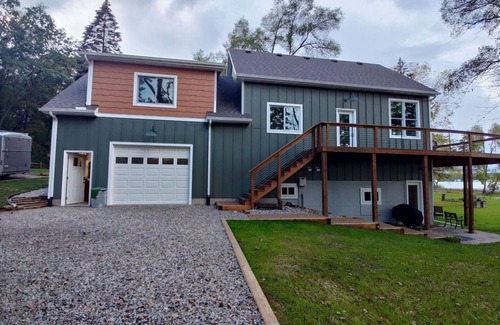 Relax with the whole family at this peaceful place to stay. Situated on beautiful all sports Wolf Lake this newly built space is gorgeous with great views from it's lofty deck.