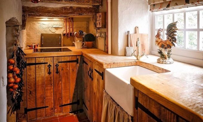 Perfect for families this quirky beautifully restored Grade II* listed 18th Century cottage sleeps 4 in two separate ensuite shower rooms. Bedroom one has a beautiful king size bed with a separate shower and toilet recessed behind the head board, whilst the second bedroom reached via a small set of wooden steps has twin beds and a separate shower room next door. Beautifully renovated, the cottage consists of a hand crafted kitchen and open plan living area which also contains the original 18th century cheese press.