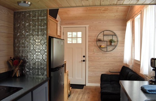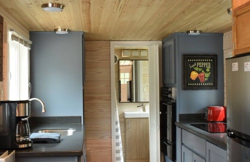 The Cheyenne Tiny Home offers a comfortable and thoughtfully designed space perfect for a memorable mountain getaway. Sleeping up to 4 guests, this charming tiny home features a queen-size bed in a spacious loft with a closet, plus a sleeper sofa on the main level. The fully equipped kitchen includes a 3/4-size fridge, induction cooktop, microwave, and wall oven, making meal prep easy and convenient. The bathroom offers a shower, flushing toilet, and sink. Relax in the living area with a Smart TV, or unwind on the private 8' x 6.5' front deck.