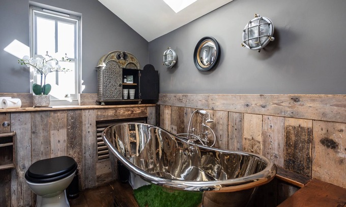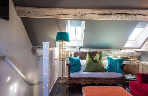 The Cocktail Lounge (sleeps 2), feels like a little house all in itself with a beautiful king size bedroom and stunning rustic bathroom, both opening onto a hallway with a winding staircase leading up to a really special little Cocktail Lounge in the loft, the ideal spot for that pre-dinner G&T. The lounge area has a large flat screen TV, squashy sofa and plenty of books and games so it’s a lovely place to cosy up after an evening out too.