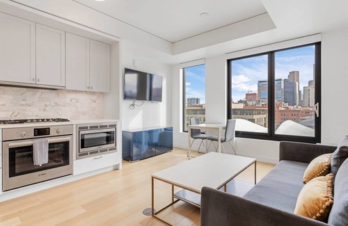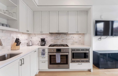 The kitchen is complete with dish-ware and offers stainless appliances, gas range, soft-close solid maple cabinets and quartz countertops. The spacious urban bedroom has a queen size bed, fresh linen, and custom closets. Included is an in-unit high efficiency washer/dryer. Step into the rich bathroom which features Calacatta marble and quality finishes.