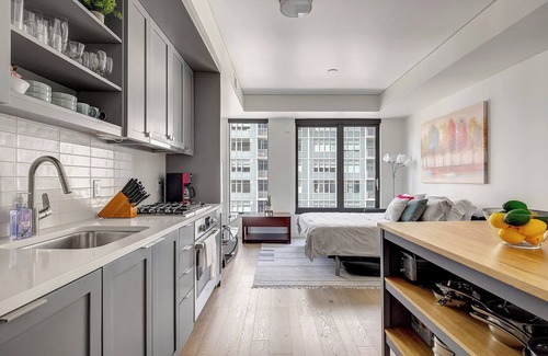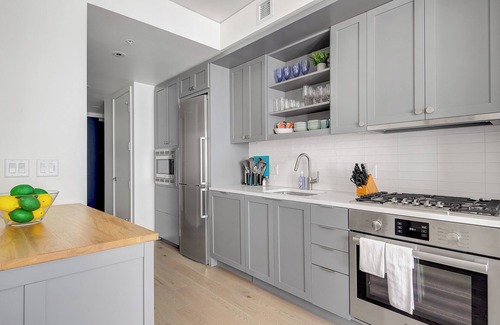 The chef-inspired kitchen is fully equipped with everything you need, including sleek stainless steel appliances, a gas range, soft-close solid maple cabinets, and stunning quartz countertops. The cozy living area features a queen-size pull-out sofa with fresh linens and a comfy mattress for a restful night’s sleep. Convenience is key, with an in-unit high-efficiency washer/dryer for all your laundry needs.