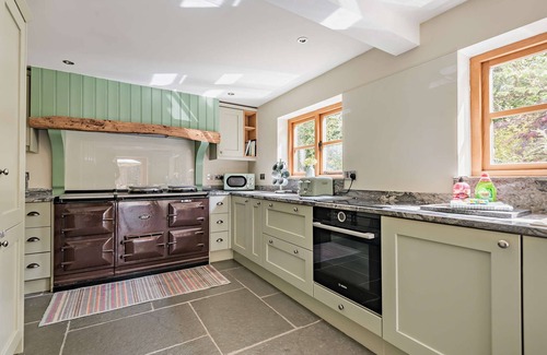 The kitchen space is exquisitely finished in light tones with a granite worktop. It has a garden and patio view, and comes fully-equipped with everything you would need for your stay, including a fridge freezer, oven & hob, separate AGA, dishwasher, washing machine, a small table and chairs, and an abundance of storage. There’s plenty of cookware, glassware, crockery, and cutlery for all your mealtimes.