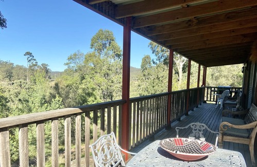 -Veranda outdoor setting with benches, dining and scenic lookout of Wollombi