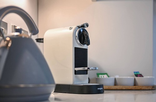 Kitchen with coffee machine, electric oven and hob, fridge with freezer box, washing machine and breakfast bar with dining stools seating 2.