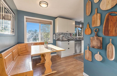 Inside, the main level blends an open-concept layout with cozy seating and warm design details. A plush sectional faces the 65” Smart TV, creating the perfect spot for game days or movie nights. The adjoining dining nook with banquette seating and a larger dining table encourages lingering over meals or planning tomorrow’s adventures.