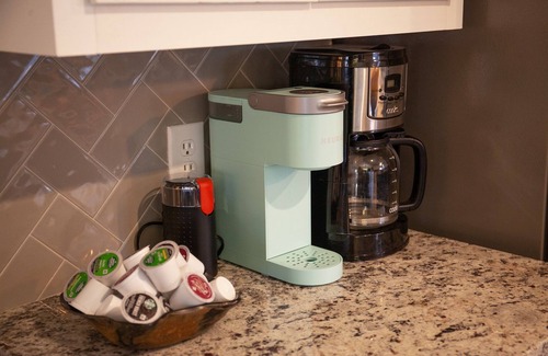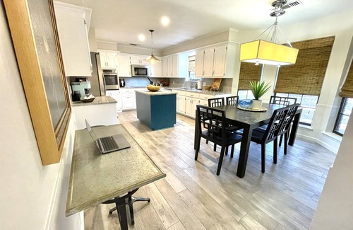 The large kitchen includes has excellent appliances, plenty of working space, and cabinetry for your groceries. Chow down at the modern dining table and chat with the cook. Find your niche to work at the desk in the kitchen or lounge on the sofa in the living room. Mature trees in the front and back yards are a delight to the eye. Relax on either the front or back porch. You'll be no more than 10-12 minutes from just about anywhere in Abilene and super close to the airport. All the snacks and beverages in the kitchen are for you. The newly-renovated bathrooms have plenty of fluffy towels, hooks for the same, hairdryer, shampoo, conditioner, and body wash. There are an iron, ironing board, and full-sized steamer in the master bedroom closet. The on-site washer and dryer are available for long-term stays. Wash This Way and Keen Cleaners provides same-day service. Contact us for pricing for special events like a bridal luncheon or party.