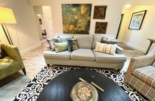 The Cowgirls is probably our most popular home. Maybe it's the two king beds or perhaps the gas fireplace that puts off tons of heat. The screened-in back patio is nice as is the front porch with veranda. All the rooms are uniquely decorated and the master bedroom receives wonderful, natural light all day long with its southern exposure. Cowgirls has hard surface floors throughout so we got to use some of our favorite rugs in this three-bedroom home. It's very near the Expo Center and airport. Please contact us for a video tour of the property.
