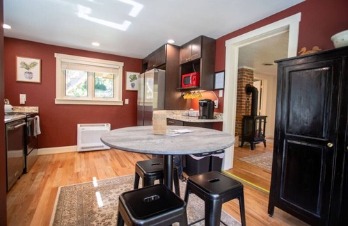 This private retreat offers a beautiful yard with a porch and patio along the creek, fire pit, and large beautiful garden(you may see our friendly gardener from time to time). The Creekside Cottage is best fit for families as the downstairs bedroom has access to the stairs leading to the upstairs bedroom. It may be worth noting that this house was built in 1910 and the upstairs ceilings are low(6 ft. 6 in.)