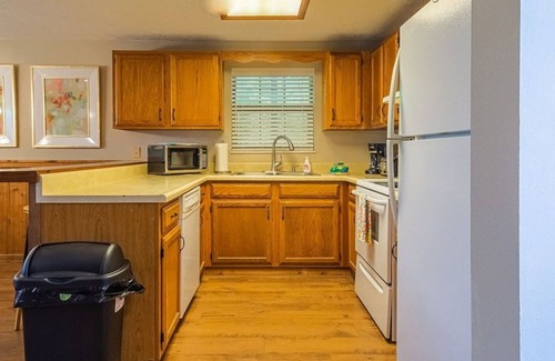 Kitchen – Main level. The kitchen is fully stocked with a fridge/freezer, pots, pans, slow cooker, microwave, cookware, silverware, plates and cups. Everything you need to make meals!