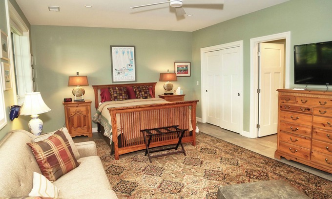 The Deluxe Apartment Suite requires mobility up and down one flight of stairs. Direct access to the patio, fire pit and dock is just steps from your own private entrance.