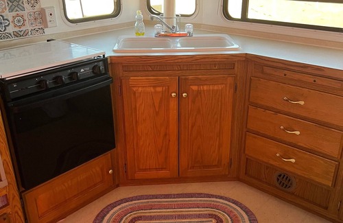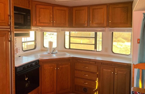 The Javelina Hitchhiker Travel Trailer comes complete with a queen-size bed with linens, microwave, stove, refrigerator, table, chairs, couch, and air conditioning. The Javelina also includes a private bathroom and shower with hot and cold running water. Accommodates up to 2 people. Pets are allowed and there is a pet fee of $10/per stay. If you bring pets, please let us know when making reservations.