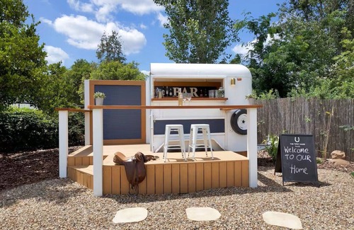 Perched up the back is a restored vintage horse float that has been converted to a bar and looks down to the back of the entertaining area.