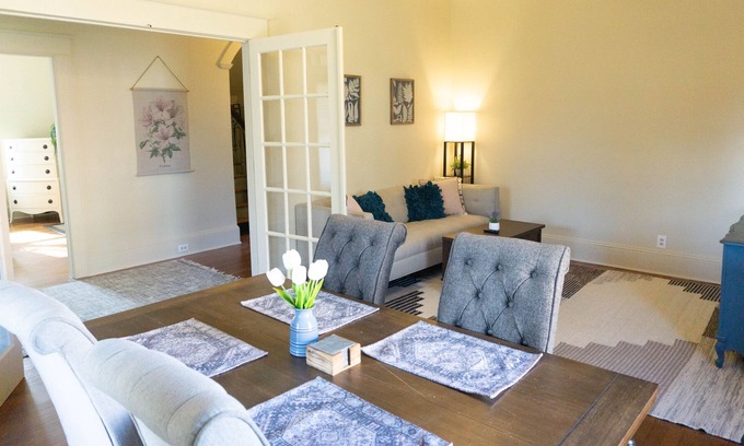 A peaceful getaway to relax, unwind, and feel at home away from home. This first floor apt is spacious and bright with a mid-century modern and eclectic style. Private guest entrance is in the rear of the main house, located in the heart of downtown Charles Town. Just park your car and walk to all the local restaurants and shops! Only 10 minutes from Historic Harpers Ferry. You will fall in love with this place.