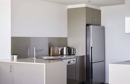 Downstairs also features it's own full kitchen, living and dining room that open up to the balcony, with a second Webber BBQ. This level has three bedrooms (7 guests), two bathrooms, internal laundry and double garage.