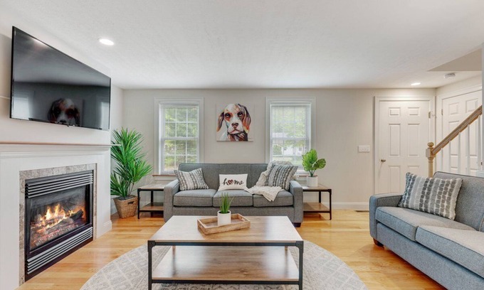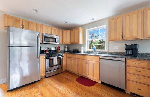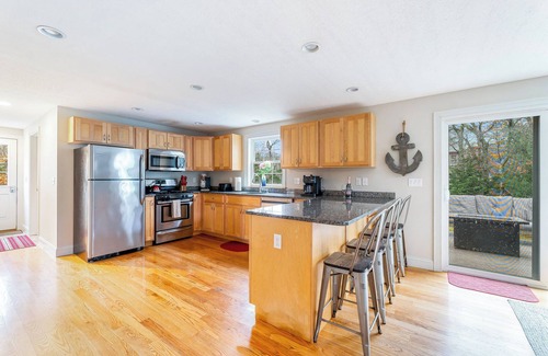 My home is rustic, modern, and tasteful. The entire home will be yours to enjoy. The home features three large bedrooms and two full bathrooms. Downstairs you will find the first bedroom featuring a queen bed right across from the first full bath. The downstairs bathroom has a large shower, and also houses a washer and dryer. Next, the kitchen is modern with granite counter tops and brand new appliances. You will find everything you need here to cook for your whole group. The Kitchen includes a six person dining table, as well as seating for four at the counter. Step outside to the deck which overlooks the backyard. The deck includes a comfortable sectional sofa for relaxing, and a fire pit for warming up on breezy nights. There is also a large BBQ grill for cooking outside. The living room is spacious, comfortable, and modern. With plenty of seating, it is a good place for the whole group to unwind after a busy day on Cape Cod. Up stairs you will find two bedrooms, and a full bathroom with tub. The first bedroom has two twin beds and plenty of storage for all of your belongings. The master bedroom has a queen bed, smart TV, and personal access to the bathroom.