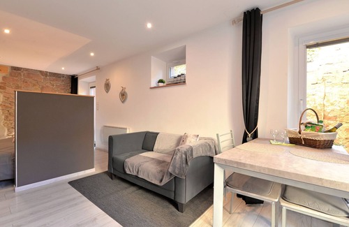 LE COCON DES CAPUCINES **** is a studio of 40 m² that can accommodate 2 people. It is located on the ground floor and consists of an entrance, a kitchenette, a dining area, a sofa and a sleeping area (double bed 160 x 200 cm), a wardrobe closet and a bathroom with toilet. Outside on a plot of 80 m², an awning with table and chairs and a green area