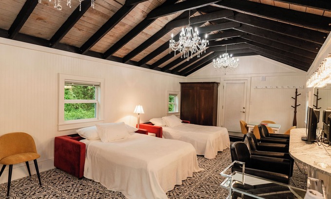 The Elderberry Studio apartment is available as an add-on. The studio is one of the four properties on the estate. It is an ideal stay for up to four people. Two queen sleeper sofas offer a comfortable sofa-by-day, bed-by-night experience. On sunny afternoons, a cozy backyard patio beckons with cushioned patio chairs and bistro-style patio furniture. The outdoor garden shower is truly one of a kind. Spend the day socializing with your group, or retreat to the privacy of the secluded deck and catch some proper R&R.