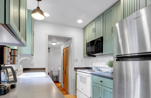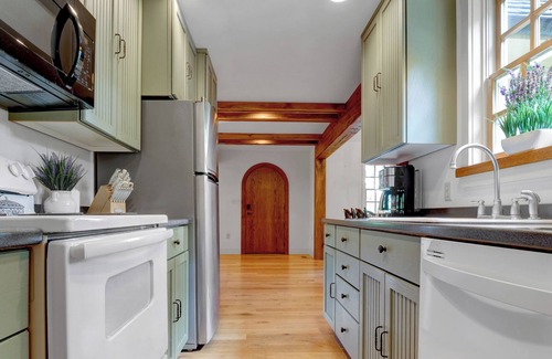 The kitchen is reminiscent of old galley kitchens in the traditional English cottage palette of sage green. Equipped with modern appliances and all the necessary utensils, it offers a seamless blend of functionality and charm.