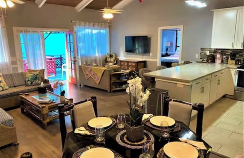 Welcome to The Famous Peacock House, a vibrant and whimsical Hawaiian getaway designed for families and friends to create unforgettable memories together. With space for large groups, thoughtful amenities, and a prime location on the lush side of the Big Island, this home is perfect for relaxation, adventure, and fun.