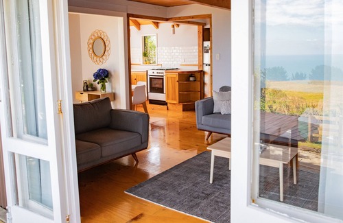 This holiday cottage is situated 8.8km from town centre and 2.8km from the beach. It is the perfect getaway for families or groups. The cottage is completely off-grid with incredible views of The Tasman sea.