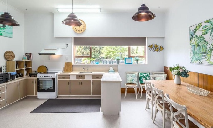 Featuring a garden, The Farmhouse On Church provides accommodations in Greytown. This vacation home offers private check-in and check-out and free Wifi. Providing access to a patio with garden views, the spacious vacation home consists of 2 bedrooms. The air-conditioned vacation home also features a TV, a fully equipped kitchen with an oven, a seating area, washing machine, and 1 bathroom with a bath and a shower. The accommodation has a fireplace. The vacation home has a picnic area where you can spend the day outdoors. Wellington Airport is 50 miles from the property.