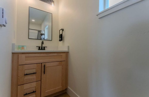 The bathroom comes stocked with fresh towels, shampoo, conditioner, and soap—everything you need to freshen up and unwind.