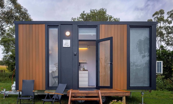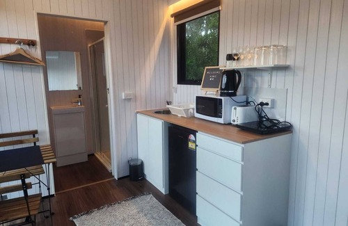A comfortable, accommodation of approximately 139 square feet is set in one of the best tiny house rentals and serene locations with abundant natural bushland, easy access to water, split air conditioning, a kitchenette, cooking equipment, and excellent bathroom facilities.