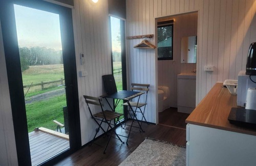 Escape to The Fog Getaway 1 by Tiny Away, a tiny house NSW retreat boasting mountain views, lush greenery, and a tranquil pond with ducks. Where you can enjoy farm life with sheep, cows, and free-roaming chickens, close to cafes, restaurants, and an IGA store. With beaches and Tea Gardens' exquisite riverfront dining options for you to explore.