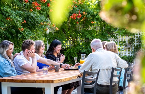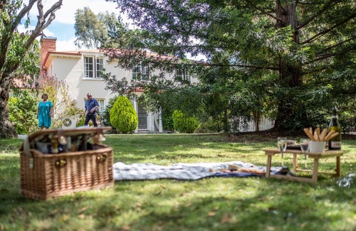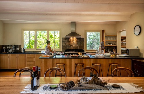 Set on 35 acres a few minutes from St Helens, a stunning mixture of bush, open fields, and relaxing gardens. The French House is a charming French country house-inspired 5 very comfortable bedroom (each with a private ensuite) home. Wood-fired heaters in the large comfortable living and dining rooms with a very spacious and well-equipped kitchen. Large locally made timber dining tables inside and in the courtyard with BBQ allow for fantastic dining options either inside or outside.