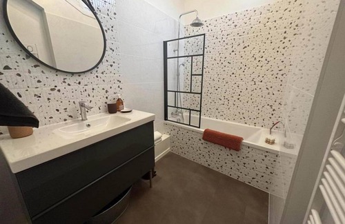 Upstairs, a practical staircase leads to 2 bedrooms of different styles, comprising 2 single beds of 90x200cm and 1 double bed of 160x200cm. You will also find a beautiful bathroom with bathtub, separate toilets, as well as an office-dressing area with storage space. Sheets, bathroom linen and household linen are provided for your stay.