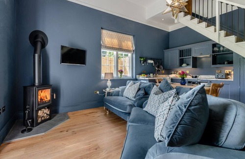 French doors open into a striking open plan living space, cleverly divided into areas for relaxing, dining or cooking. There is a wood burner, perfect for snuggling beside whilst you watch your favourite shows on the Smart TV. Just behind is the table for two and contemporary kitchen area. When the day is done head upstairs into the inviting king size bedroom (with zip and link beds) which has a stylish en-suite shower room leading from it. Here you can wake up to parkland views and admire the character on offer. Due to the setting within the eaves there are some areas of restricted head height on the first floor, which only adds to the charm of the room.