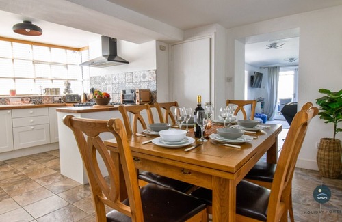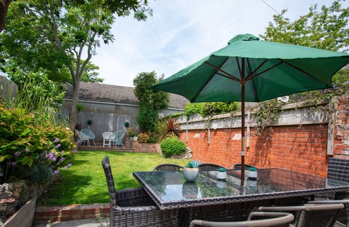 Double doors open out to a lovely enclosed rear garden with side access and a hose pipe to wash sandy dogs off from a day at the beach. There is a paved seating area as you step out of the house, with rattan outdoor seating, glass topped dining table and cushions - perfect for enjoying a BBQ on a summers evening. Further up the lawned garden is a decked seating area, where you can enjoy your morning coffee in the sunshine.