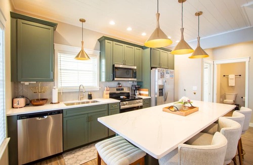 As you walk in from the welcoming covered porch, you are greeted with an airy, fully-furnished, open-concept living space that features a beautiful, well-equipped kitchen which has everything you need from making a fresh morning cup of coffee to a tasty home-cooked meal. The living room is the perfect spot to put your feet up and relax after a long day on the lake. You can flip on the Smart TV, sign in to your streaming account and catch up on your favorite shows or movies. We have also provided you with a variety of games that will keep you entertained even on those rainy afternoons! The main level also consists of a private bedroom with a king bed as well as full bathroom with a walk-in shower.