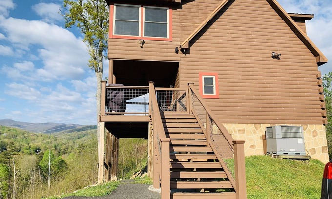 AWESOME cabin !! Renovated. Sleeps 4. Loft bedroom with king-sized bed, custom Murphy bed, and 1 full bath upstairs, and 1/2 bath downstairs. AMAZING views of Mt. LeConte & Clingman's Dome!! Fully equipped kitchen with updated stainless appliances. Single serve Keurig coffee maker with complementary coffee & tea pods. Washer/Dryer, WIFI, & Dish TV. New copper roof, and gorgeous porch/deck with Hot Tub and custom wire railing. Private, driveway. Security system with keyless entry & personalized access codes for visitors. Stone fireplace. New sunroom off of bedroom lets you enjoy the spectacular view year round !! Authentic, beautiful, 100+ year old barn doors add privacy and shade between bedroom & sunroom. Ample, level parking. Pets allowed upon approval of owner and acceptance of rental/pet agreement. They will even have their own lighted, picket fenced puppy yard!! NO smoking. Private, yet just minutes away from shopping, hiking trails, restaurants, downtown Gatlinburg & Pigeon Forge !