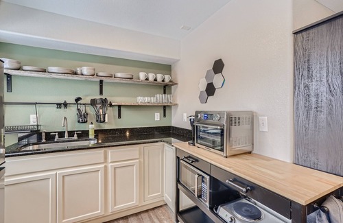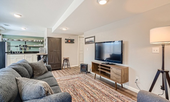Large, private 1-bedroom suite w/ king size bed and private entrance convenient to Boulder and Denver. This is an updated, impeccably clean, and inviting space! 1 large bedroom, full bath with tub and shower, kitchenette, dining, living room with queen sleeper sofa, office and small patio area. Kitchenette includes refrigerator, convection/air fryer/toaster oven, double hot plate, microwave, Keurig, and all the cooking gadgets you will need. TV includes streaming and basic cable.